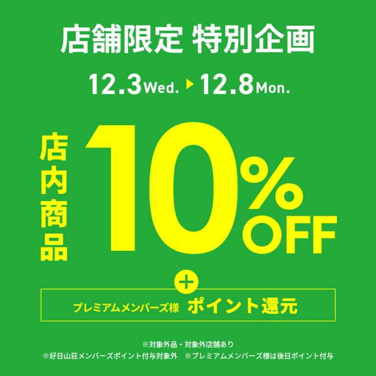 店内商品10%offキャンペーン開催中 2025.12.03 好日山荘 12月3日(水)~12月8日(月)まで 店内商品10%offキャンペーンを開催いたします。 是非ご来店くださいませ。 ※一部対象外商品がございます詳しくはスタッフまで。 新メニュー とろけるマスカルポーネチーズのムース ドライフルー... 関連記事一覧 “【CoCoRoPlus】 「デュオ ザ クレンジングバー... 2022.07.27 “~CoCoRo Plus~ 「BARTH(バース)」から新商... 2022.10.12 【CoCoRo Plus】 ブレンドベリー3Dアイブロウでお好み... 2022.05.28 店内商品10%OFF 2025.01.17 新春特別企画『大感謝祭』 2025.01.02 新富士バーナーのSOTO(ソト)商品をご購入いただくと... 2024.04.26 毎週木曜日はレディースデーです★ 2023.07.06 “~CoCoRo Plus~ 目覚めるHARI美肌! “ 2022.07.09