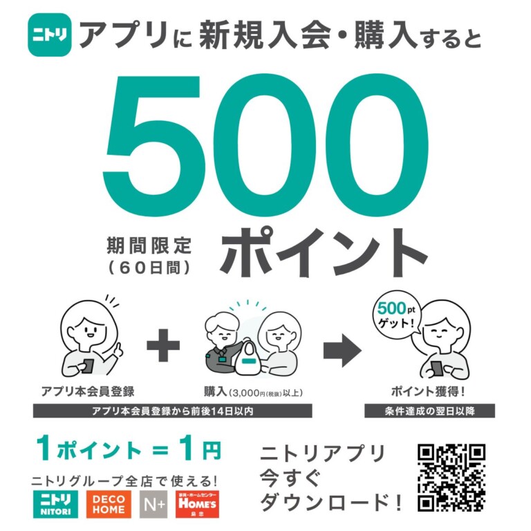 ニトリアプリに新規入会し3,000円(税抜)以上購入すると、アプリ新規入会特典ポイント(60日間の期間限定ポイント)が獲得できます!