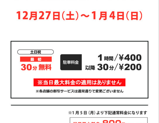 お客様各位 日頃よりテラッソ姫路をご利用頂きありがとうございます。 テラッソ姫路駐車場は年末年始特別料金となります...