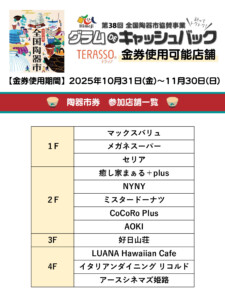 陶器市一覧表2025 2025.10.22 テラッソ姫路 関連記事一覧 ご好評につきまとめ買いキャンペーン延長致します☆ 2024.09.01 涼感シューズ FAIR開催中!! 2025.07.07 【11/14(金)~】古着MARKET CLOTHING PARADE 2025.11.03 店舗限定ポイントアップキャンペーン 2025.11.02 ADIDAS ランニングフェア開催中!! 2025.08.30 季節限定パスタ(11/1~11/30)サーモンとキノコのジェ... 2025.11.03 マックスバリュ お客さまわくわくデー 2020.07.01 上品さと快適さを叶える新定番【PUMA YONGI】 2025.09.13