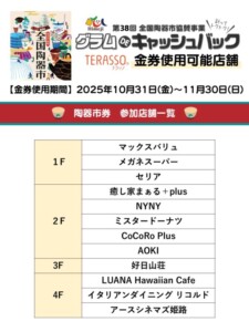 陶器市一覧表2025 2025.10.22 テラッソ姫路 関連記事一覧 身体に合わせた最適コースを診断&すっきりケア♪初回990円 2024.12.01 限定特別企画開催! 2024.03.07 店舗限定キャンペーンのお知らせ 2025.06.03 姫路しらさぎ商品券2025 2025.10.25 NIKE AIRMAX EXCEE 新色入荷しました。 2022.01.28 CONVERSEより新作入荷しました。 2022.01.28 cocone 2023.08.01 明日8/8(木)はレディースデーです 2024.08.07