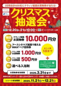 クリスマス抽選会2025 2025.11.25 テラッソ姫路 関連記事一覧 【CoCoRo Plus】 誰でも使える、誰かと使える シェア... 2022.05.14 リニューアルオープン☆ 2024.11.22 夏の追い込みヤセならデフィーのインドエステ★990円で... 2024.07.01 デフィー創業25周年! ボディ・フェイシャル全エステコ... 2022.02.01 おトクなキャンペーンやクーポン盛りだくさん!テラッ... 2025.04.01 【ニトリデコホーム】マイナスイオンヘアケアドライヤー 2025.11.28 【2階_ニトリ デコホーム】創業祭開催中!! 2024.12.10 夏に向けて美脚づくり♪初回990円で効果実感!! 2024.06.01