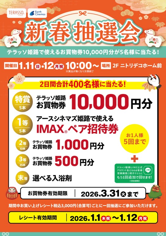参加条件:期間中、テラッソ姫路のお買い上げレシート税込3,000円以上(合算可)ごとに1回抽選にご参加いただけます。