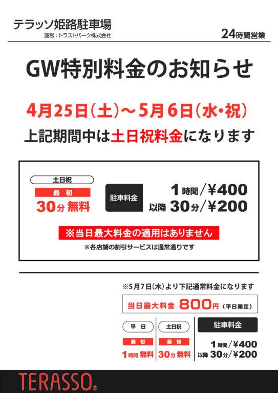 テラッソ姫路駐車場はゴールデンウィーク特別料金となりますので、ご案内申し上げます。