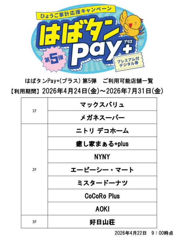 ひょうご家計応援キャンペーンプレミアム付デジタル券「はばタンPay+(プラス)」第5弾